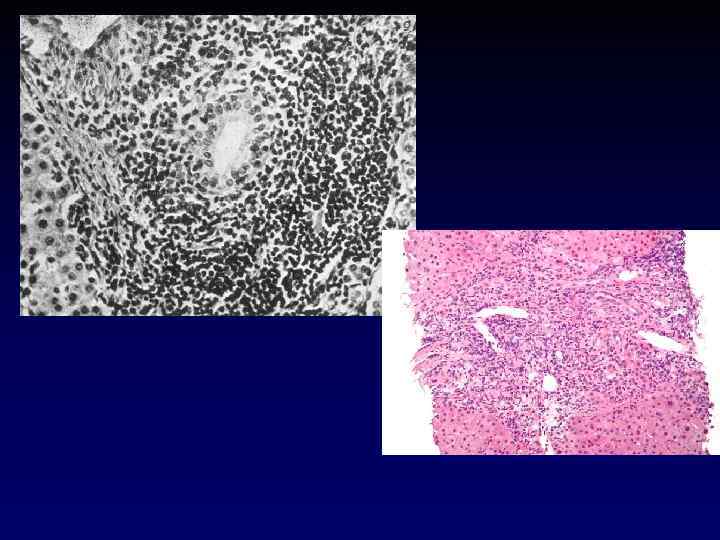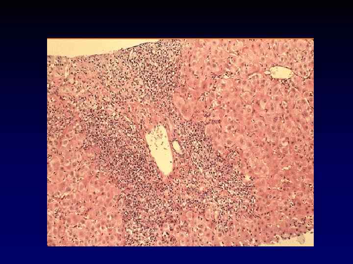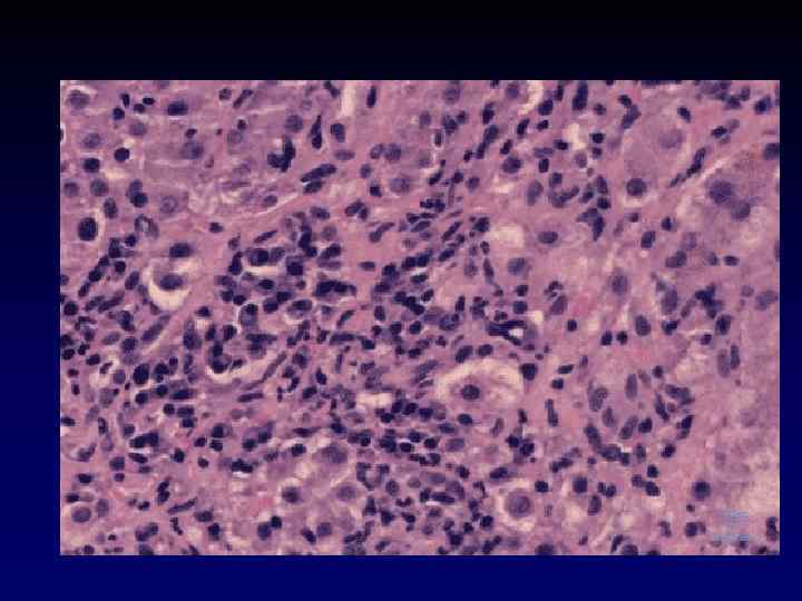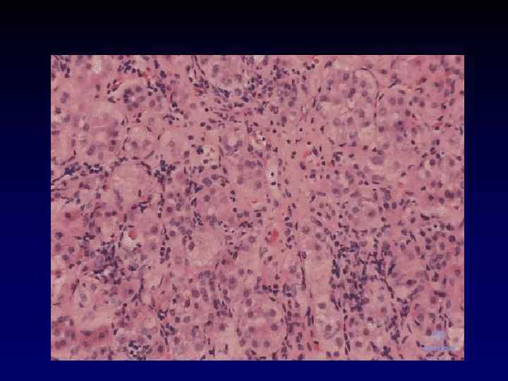 Гистологические изменения • Перипортальное воспаление • Плазмаклеточная инфильтрация • Вовлечение в воспалительный процесс всех отделов ацинуса (панацинарный гепатит) • Центролобулярный некроз