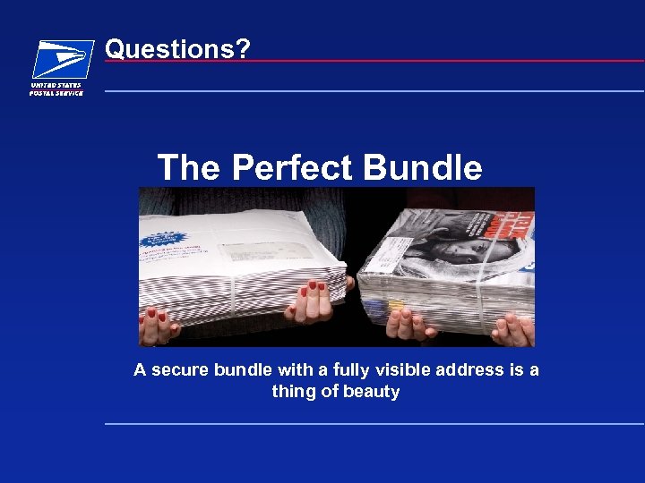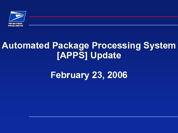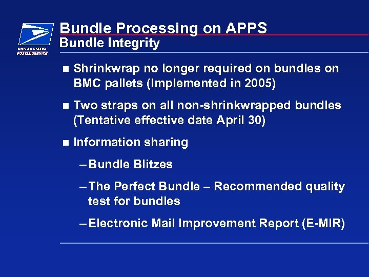 Bundle Processing on APPS Bundle Integrity n Shrinkwrap no longer required on bundles on BMC pallets (Implemented in 2005) n Two straps on all non-shrinkwrapped bundles (Tentative effective date April 30) n Information sharing – Bundle Blitzes – The Perfect Bundle – Recommended quality test for bundles – Electronic Mail Improvement Report (E-MIR)