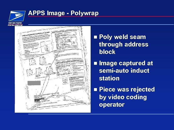 APPS Image - Polywrap n Poly weld seam through address block n Image captured at semi-auto induct station n Piece was rejected by video coding operator
