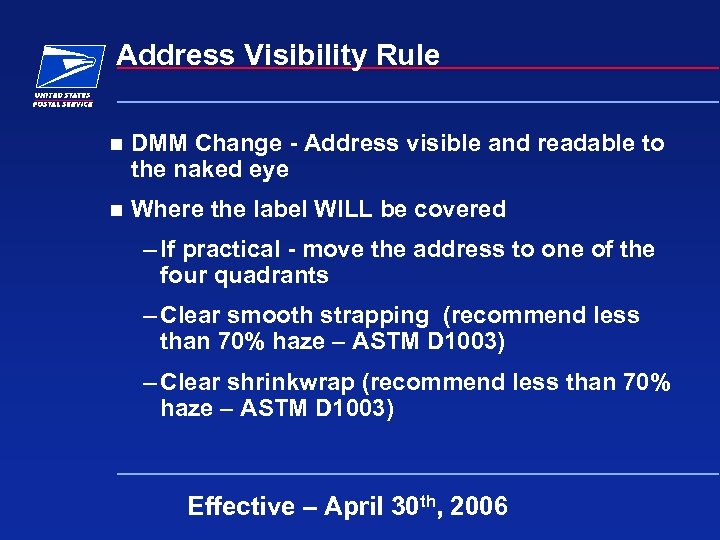 Address Visibility Rule n DMM Change - Address visible and readable to the naked eye n Where the label WILL be covered – If practical - move the address to one of the four quadrants – Clear smooth strapping (recommend less than 70% haze – ASTM D 1003) – Clear shrinkwrap (recommend less than 70% haze – ASTM D 1003) Effective – April 30 th, 2006