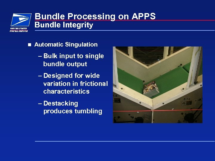 Bundle Processing on APPS Bundle Integrity n Automatic Singulation – Bulk input to single bundle output – Designed for wide variation in frictional characteristics – Destacking produces tumbling