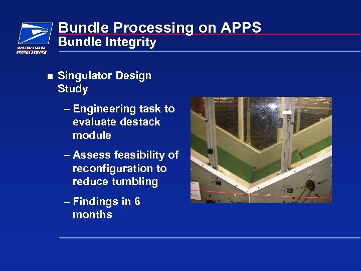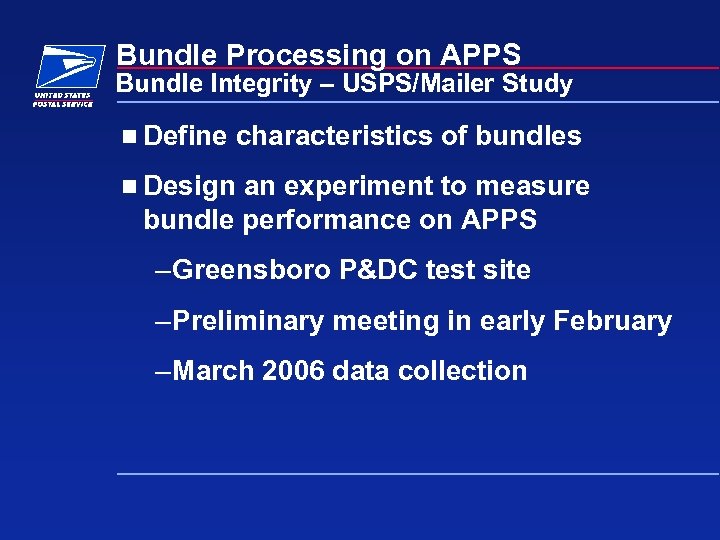 Bundle Processing on APPS Bundle Integrity – USPS/Mailer Study n Define characteristics of bundles n Design an experiment to measure bundle performance on APPS – Greensboro P&DC test site – Preliminary meeting in early February – March 2006 data collection