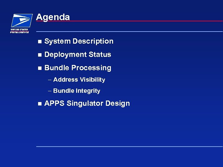 Agenda n System Description n Deployment Status n Bundle Processing – Address Visibility – Bundle Integrity n APPS Singulator Design