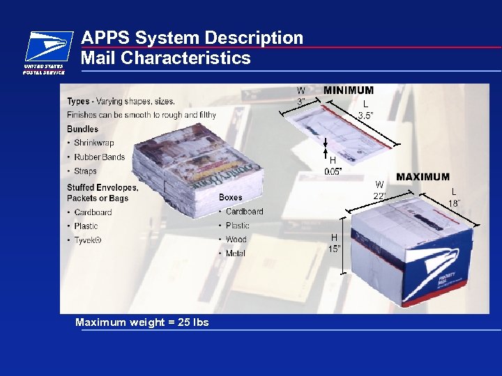 APPS System Description Mail Characteristics Maximum weight = 25 lbs
