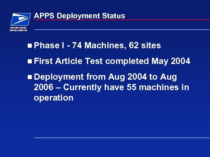 APPS Deployment Status n Phase n First I - 74 Machines, 62 sites Article Test completed May 2004 n Deployment from Aug 2004 to Aug 2006 – Currently have 55 machines in operation