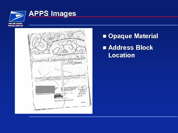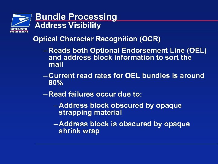 Bundle Processing Address Visibility Optical Character Recognition (OCR) – Reads both Optional Endorsement Line (OEL) and address block information to sort the mail – Current read rates for OEL bundles is around 80% – Read failures occur due to: – Address block obscured by opaque strapping material – Address block is obscured by opaque shrink wrap