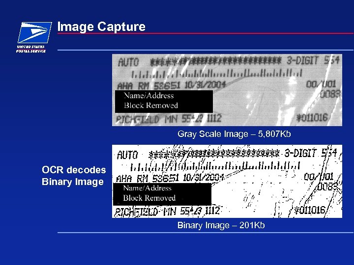 Image Capture Gray Scale Image – 5, 807 Kb OCR decodes Binary Image – 201 Kb