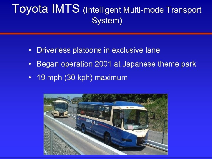 Toyota IMTS (Intelligent Multi-mode Transport System) • Driverless platoons in exclusive lane • Began operation 2001 at Japanese theme park • 19 mph (30 kph) maximum