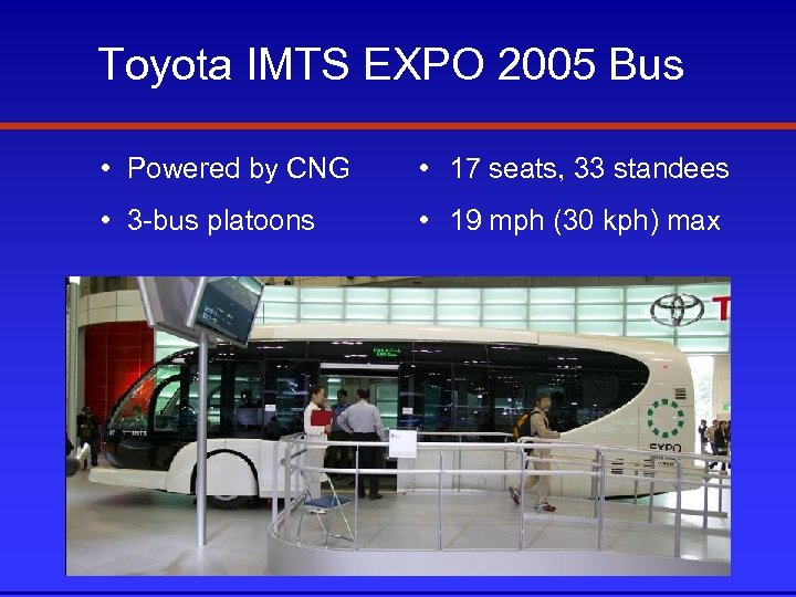 Toyota IMTS EXPO 2005 Bus • Powered by CNG • 17 seats, 33 standees • 3 -bus platoons • 19 mph (30 kph) max