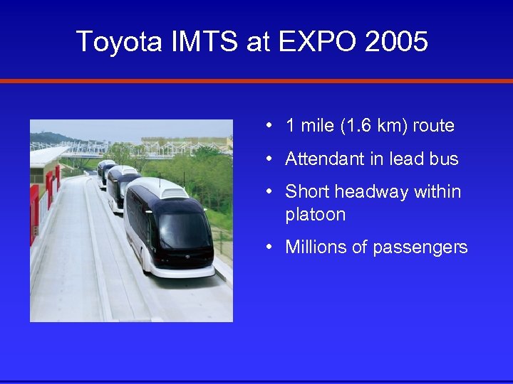Toyota IMTS at EXPO 2005 • 1 mile (1. 6 km) route • Attendant in lead bus • Short headway within platoon • Millions of passengers