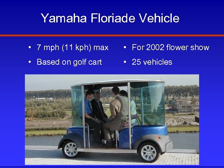 Yamaha Floriade Vehicle • 7 mph (11 kph) max • For 2002 flower show • Based on golf cart • 25 vehicles