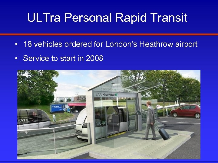 ULTra Personal Rapid Transit • 18 vehicles ordered for London’s Heathrow airport • Service to start in 2008