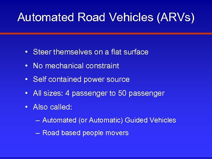 Automated Road Vehicles (ARVs) • Steer themselves on a flat surface • No mechanical constraint • Self contained power source • All sizes: 4 passenger to 50 passenger • Also called: – Automated (or Automatic) Guided Vehicles – Road based people movers