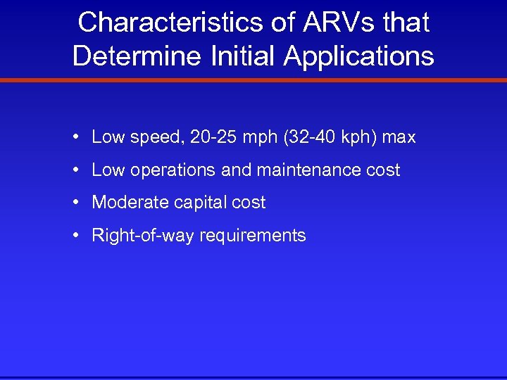 Characteristics of ARVs that Determine Initial Applications • Low speed, 20 -25 mph (32 -40 kph) max • Low operations and maintenance cost • Moderate capital cost • Right-of-way requirements