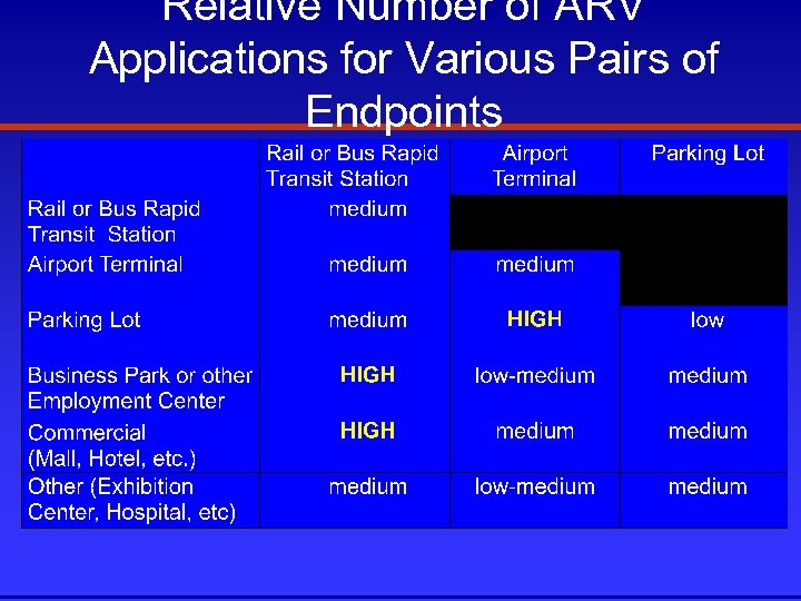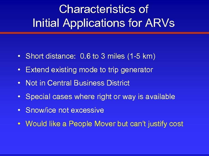 Characteristics of Initial Applications for ARVs • Short distance: 0. 6 to 3 miles (1 -5 km) • Extend existing mode to trip generator • Not in Central Business District • Special cases where right or way is available • Snow/ice not excessive • Would like a People Mover but can’t justify cost
