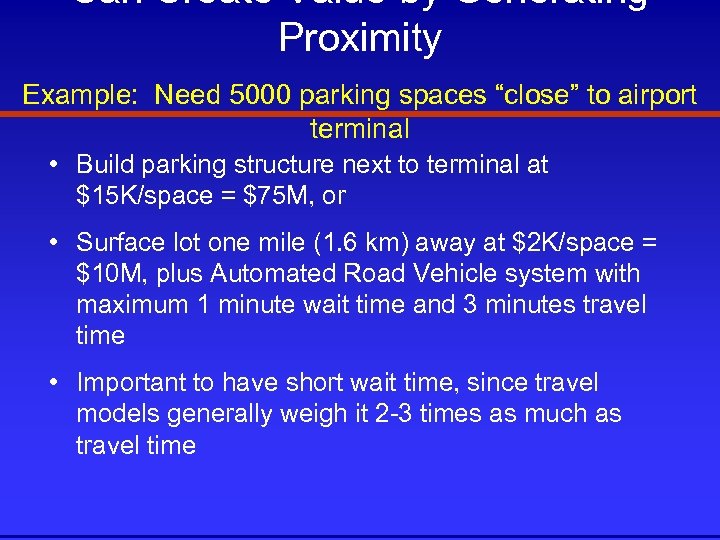 Can Create Value by Generating Proximity Example: Need 5000 parking spaces “close” to airport terminal • Build parking structure next to terminal at $15 K/space = $75 M, or • Surface lot one mile (1. 6 km) away at $2 K/space = $10 M, plus Automated Road Vehicle system with maximum 1 minute wait time and 3 minutes travel time • Important to have short wait time, since travel models generally weigh it 2 -3 times as much as travel time