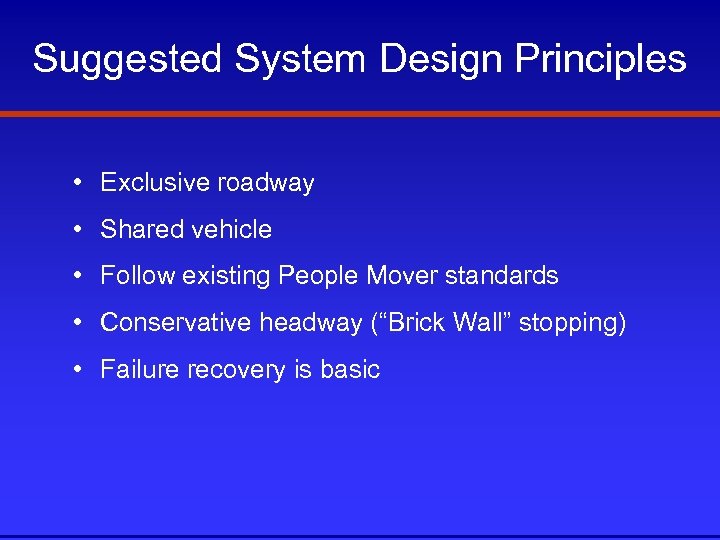 Suggested System Design Principles • Exclusive roadway • Shared vehicle • Follow existing People Mover standards • Conservative headway (“Brick Wall” stopping) • Failure recovery is basic
