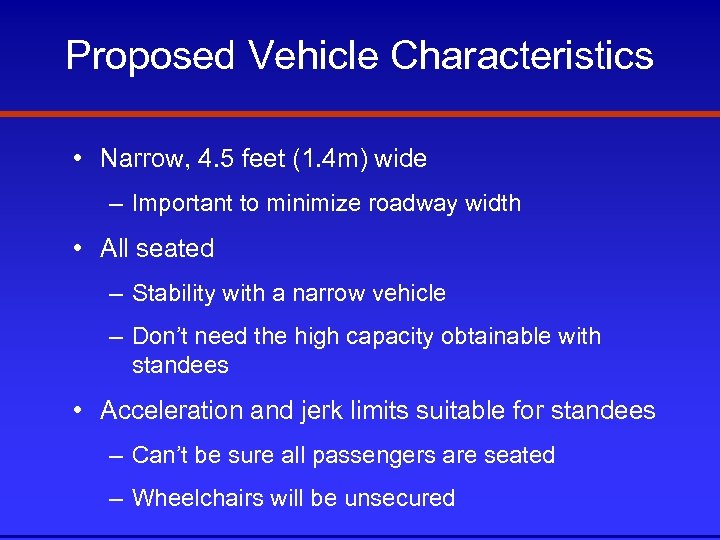 Proposed Vehicle Characteristics • Narrow, 4. 5 feet (1. 4 m) wide – Important to minimize roadway width • All seated – Stability with a narrow vehicle – Don’t need the high capacity obtainable with standees • Acceleration and jerk limits suitable for standees – Can’t be sure all passengers are seated – Wheelchairs will be unsecured