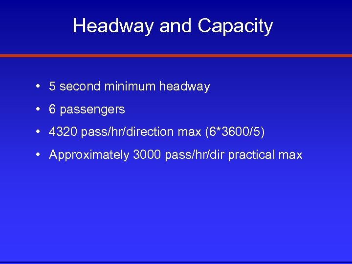 Headway and Capacity • 5 second minimum headway • 6 passengers • 4320 pass/hr/direction max (6*3600/5) • Approximately 3000 pass/hr/dir practical max