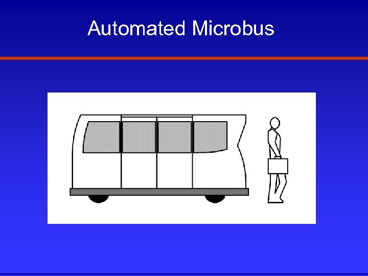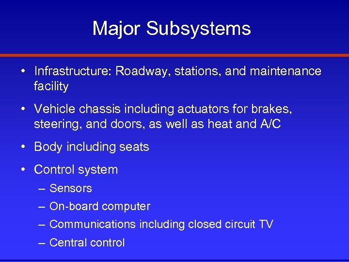 Major Subsystems • Infrastructure: Roadway, stations, and maintenance facility • Vehicle chassis including actuators for brakes, steering, and doors, as well as heat and A/C • Body including seats • Control system – Sensors – On-board computer – Communications including closed circuit TV – Central control