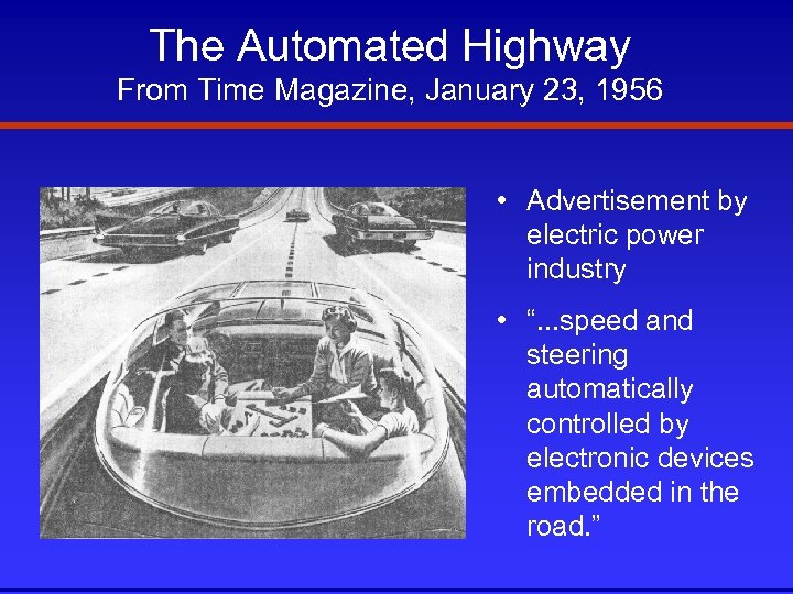 The Automated Highway From Time Magazine, January 23, 1956 • Advertisement by electric power industry • “. . . speed and steering automatically controlled by electronic devices embedded in the road. ”