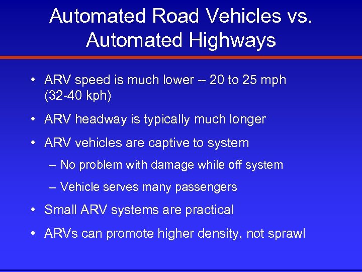 Automated Road Vehicles vs. Automated Highways • ARV speed is much lower -- 20 to 25 mph (32 -40 kph) • ARV headway is typically much longer • ARV vehicles are captive to system – No problem with damage while off system – Vehicle serves many passengers • Small ARV systems are practical • ARVs can promote higher density, not sprawl
