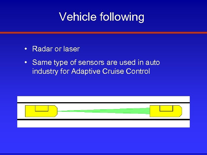 Vehicle following • Radar or laser • Same type of sensors are used in auto industry for Adaptive Cruise Control