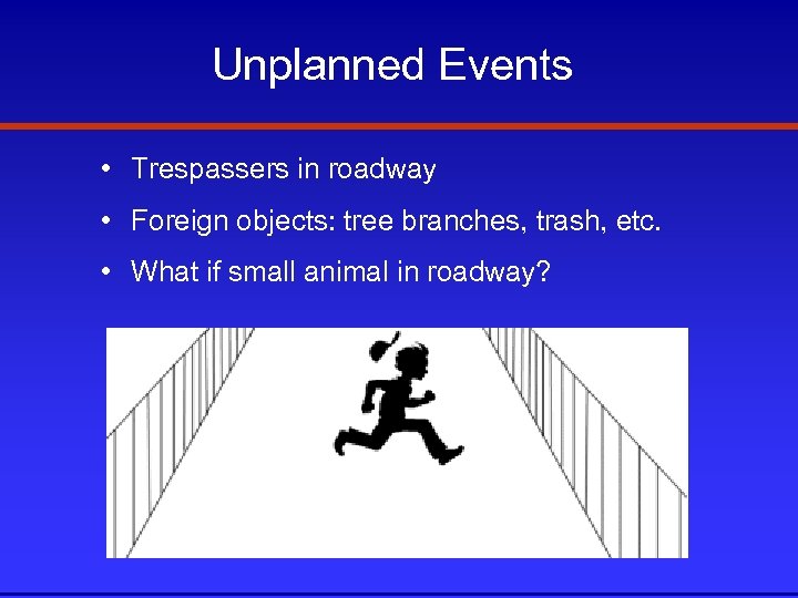 Unplanned Events • Trespassers in roadway • Foreign objects: tree branches, trash, etc. • What if small animal in roadway?