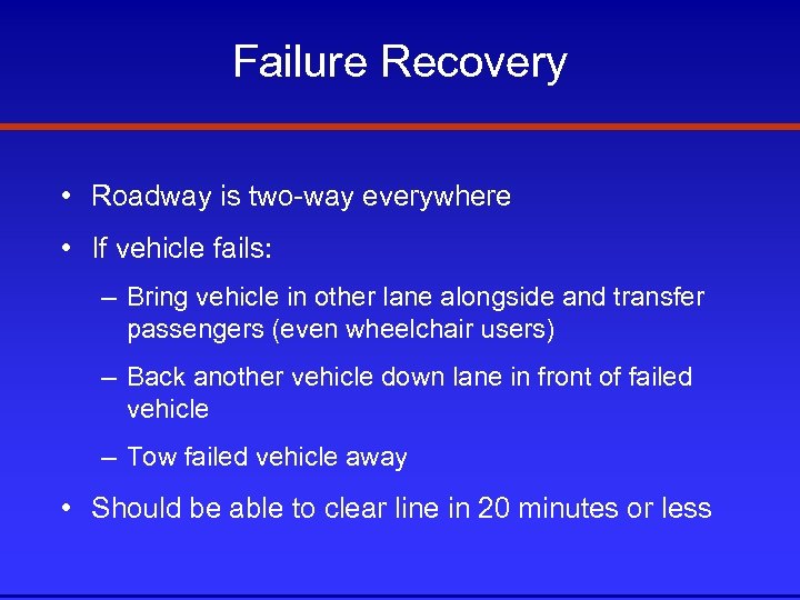 Failure Recovery • Roadway is two-way everywhere • If vehicle fails: – Bring vehicle in other lane alongside and transfer passengers (even wheelchair users) – Back another vehicle down lane in front of failed vehicle – Tow failed vehicle away • Should be able to clear line in 20 minutes or less