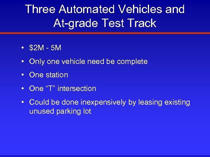 Three Automated Vehicles and At-grade Test Track • $2 M - 5 M • Only one vehicle need be complete • One station • One “T” intersection • Could be done inexpensively by leasing existing unused parking lot