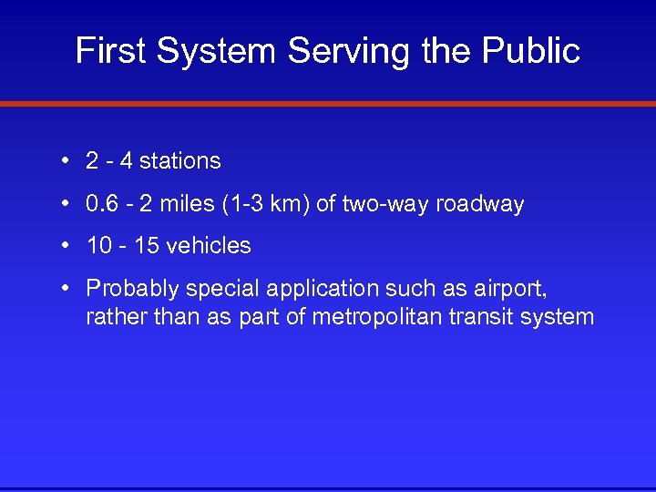 First System Serving the Public • 2 - 4 stations • 0. 6 - 2 miles (1 -3 km) of two-way roadway • 10 - 15 vehicles • Probably special application such as airport, rather than as part of metropolitan transit system