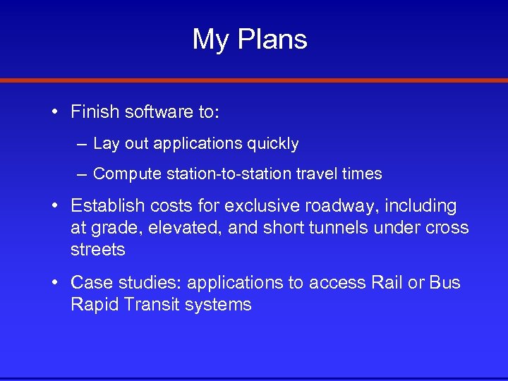 My Plans • Finish software to: – Lay out applications quickly – Compute station-to-station travel times • Establish costs for exclusive roadway, including at grade, elevated, and short tunnels under cross streets • Case studies: applications to access Rail or Bus Rapid Transit systems