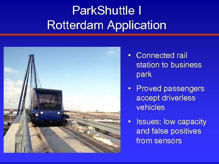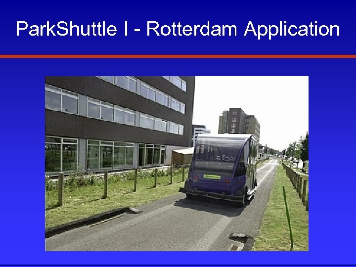 Park. Shuttle I Rotterdam Application • Connected rail station to business park • Proved passengers accept driverless vehicles • Issues: low capacity and false positives from sensors