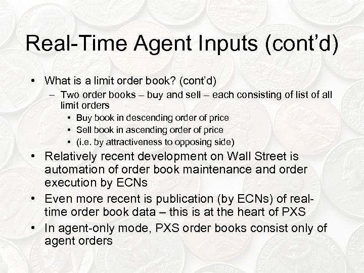 Real-Time Agent Inputs (cont’d) • What is a limit order book? (cont’d) – Two order books – buy and sell – each consisting of list of all limit orders • Buy book in descending order of price • Sell book in ascending order of price • (i. e. by attractiveness to opposing side) • Relatively recent development on Wall Street is automation of order book maintenance and order execution by ECNs • Even more recent is publication (by ECNs) of realtime order book data – this is at the heart of PXS • In agent-only mode, PXS order books consist only of agent orders
