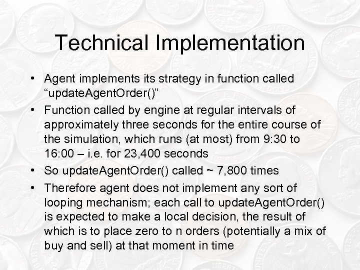 Technical Implementation • Agent implements its strategy in function called “update. Agent. Order()” • Function called by engine at regular intervals of approximately three seconds for the entire course of the simulation, which runs (at most) from 9: 30 to 16: 00 – i. e. for 23, 400 seconds • So update. Agent. Order() called ~ 7, 800 times • Therefore agent does not implement any sort of looping mechanism; each call to update. Agent. Order() is expected to make a local decision, the result of which is to place zero to n orders (potentially a mix of buy and sell) at that moment in time
