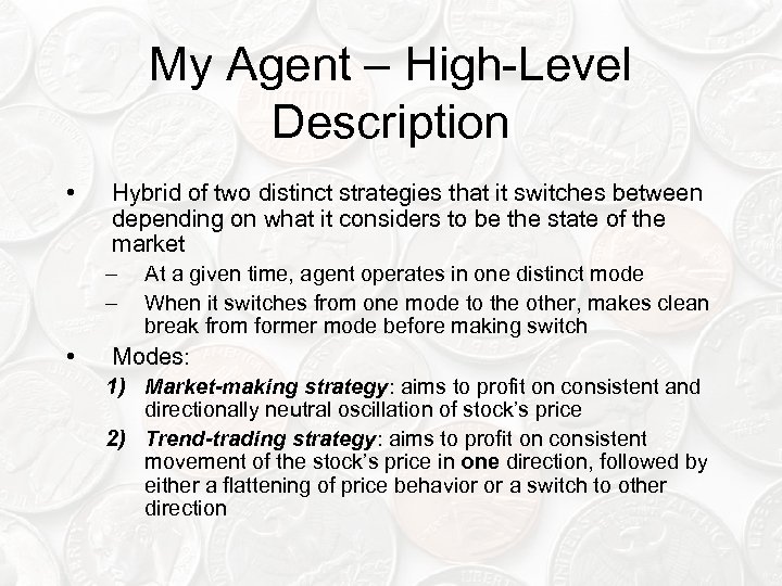 My Agent – High-Level Description • Hybrid of two distinct strategies that it switches between depending on what it considers to be the state of the market – – • At a given time, agent operates in one distinct mode When it switches from one mode to the other, makes clean break from former mode before making switch Modes: 1) Market-making strategy: aims to profit on consistent and directionally neutral oscillation of stock’s price 2) Trend-trading strategy: aims to profit on consistent movement of the stock’s price in one direction, followed by either a flattening of price behavior or a switch to other direction