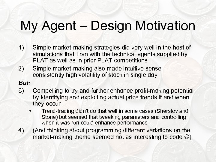 My Agent – Design Motivation 1) Simple market-making strategies did very well in the host of simulations that I ran with the technical agents supplied by PLAT as well as in prior PLAT competitions Simple market-making also made intuitive sense – consistently high volatility of stock in single day 2) But: 3) Compelling to try and further enhance profit-making potential by identifying and exploiting actual price trends if and when they occur • 4) Trend-trading didn’t do that well in some cases (Sherstov and Stone) but seemed that tweaking parameters and controlling when it was run could enhance performance (And thinking about programming different variations on the market-making theme seemed not as interesting to code )