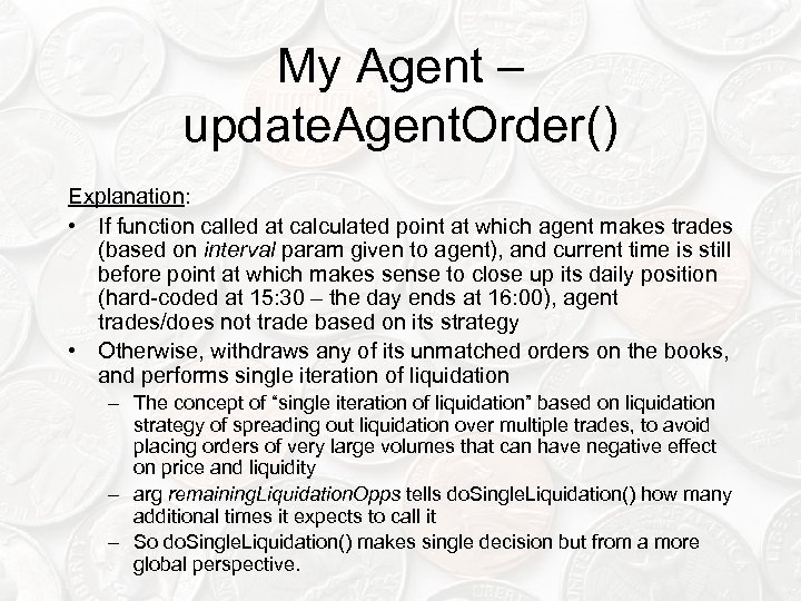 My Agent – update. Agent. Order() Explanation: • If function called at calculated point at which agent makes trades (based on interval param given to agent), and current time is still before point at which makes sense to close up its daily position (hard-coded at 15: 30 – the day ends at 16: 00), agent trades/does not trade based on its strategy • Otherwise, withdraws any of its unmatched orders on the books, and performs single iteration of liquidation – The concept of “single iteration of liquidation” based on liquidation strategy of spreading out liquidation over multiple trades, to avoid placing orders of very large volumes that can have negative effect on price and liquidity – arg remaining. Liquidation. Opps tells do. Single. Liquidation() how many additional times it expects to call it – So do. Single. Liquidation() makes single decision but from a more global perspective.