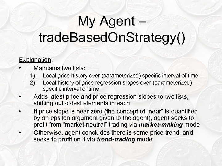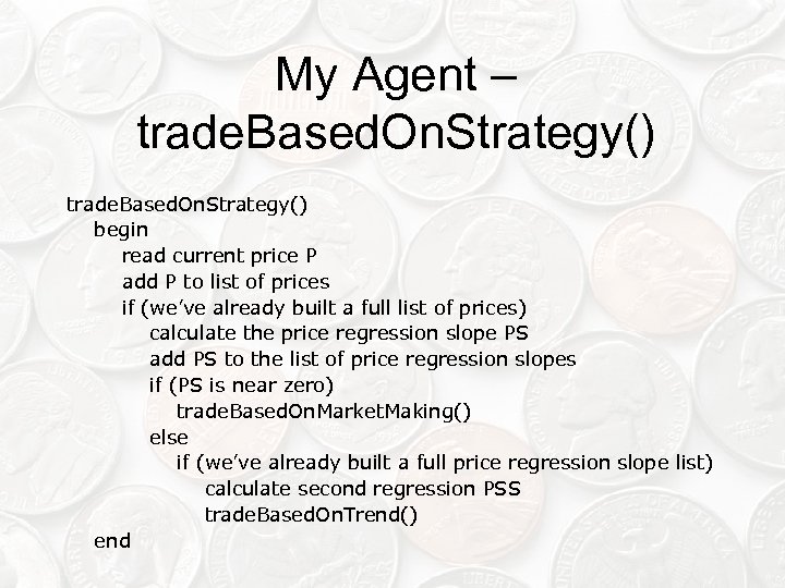 My Agent – trade. Based. On. Strategy() begin read current price P add P to list of prices if (we’ve already built a full list of prices) calculate the price regression slope PS add PS to the list of price regression slopes if (PS is near zero) trade. Based. On. Market. Making() else if (we’ve already built a full price regression slope list) calculate second regression PSS trade. Based. On. Trend() end