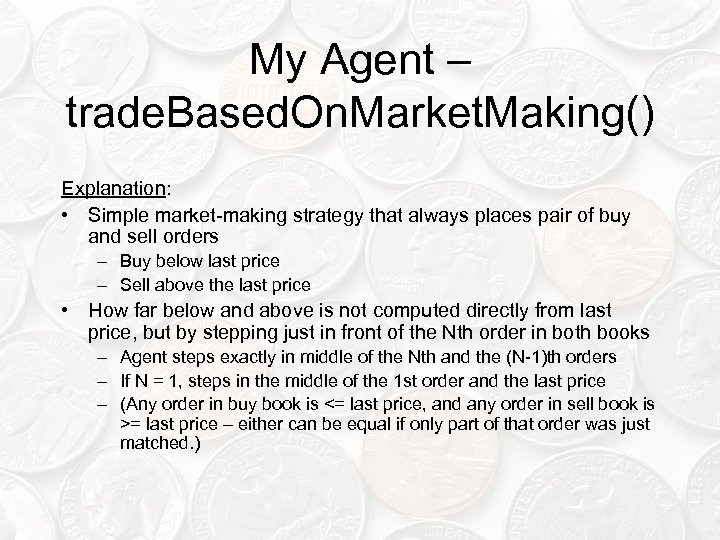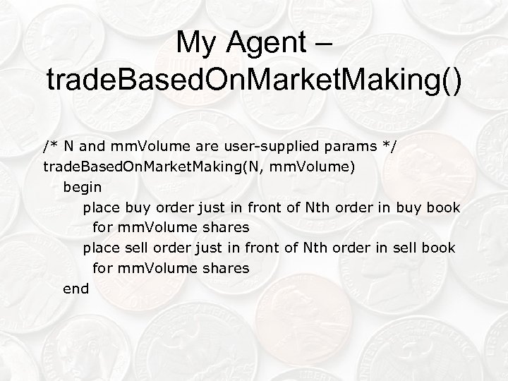 My Agent – trade. Based. On. Market. Making() /* N and mm. Volume are user-supplied params */ trade. Based. On. Market. Making(N, mm. Volume) begin place buy order just in front of Nth order in buy book for mm. Volume shares place sell order just in front of Nth order in sell book for mm. Volume shares end
