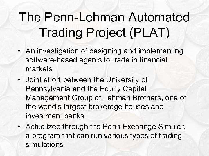 The Penn-Lehman Automated Trading Project (PLAT) • An investigation of designing and implementing software-based agents to trade in financial markets • Joint effort between the University of Pennsylvania and the Equity Capital Management Group of Lehman Brothers, one of the world’s largest brokerage houses and investment banks • Actualized through the Penn Exchange Simular, a program that can run various types of trading simulations