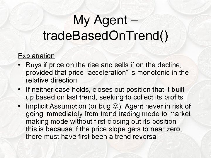 My Agent – trade. Based. On. Trend() Explanation: • Buys if price on the rise and sells if on the decline, provided that price “acceleration” is monotonic in the relative direction • If neither case holds, closes out position that it built up based on last trend, seeking to collect its profits • Implicit Assumption (or bug ): Agent never in risk of going immediately from trend trading mode to market making mode without first closing out its position – this is because if the price slope gets to near zero, there must have first been a trend reversal