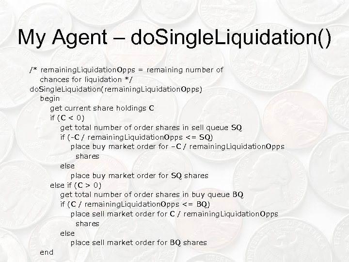 My Agent – do. Single. Liquidation() /* remaining. Liquidation. Opps = remaining number of chances for liquidation */ do. Single. Liquidation(remaining. Liquidation. Opps) begin get current share holdings C if (C < 0) get total number of order shares in sell queue SQ if (-C / remaining. Liquidation. Opps <= SQ) place buy market order for –C / remaining. Liquidation. Opps shares else place buy market order for SQ shares else if (C > 0) get total number of order shares in buy queue BQ if (C / remaining. Liquidation. Opps <= BQ) place sell market order for C / remaining. Liquidation. Opps shares else place sell market order for BQ shares end