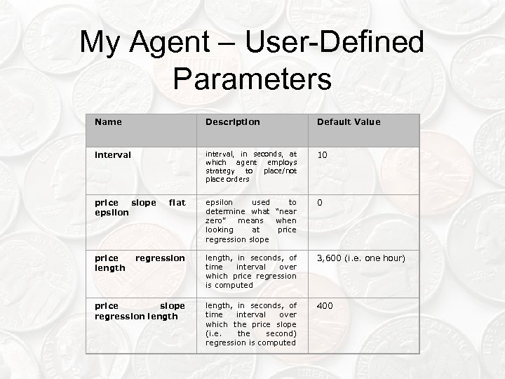 My Agent – User-Defined Parameters Name Description Default Value interval, in seconds, at which agent employs strategy to place/not place orders 10 flat epsilon used to determine what “near zero” means when looking at price regression slope 0 regression length, in seconds, of time interval over which price regression is computed 3, 600 (i. e. one hour) price slope regression length, in seconds, of time interval over which the price slope (i. e. the second) regression is computed 400 price slope epsilon price length