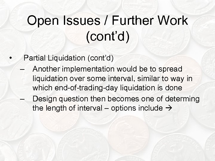Open Issues / Further Work (cont’d) • Partial Liquidation (cont’d) – Another implementation would be to spread liquidation over some interval, similar to way in which end-of-trading-day liquidation is done – Design question then becomes one of determing the length of interval – options include