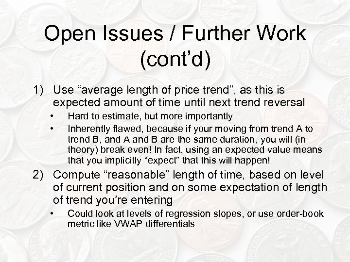 Open Issues / Further Work (cont’d) 1) Use “average length of price trend”, as this is expected amount of time until next trend reversal • • Hard to estimate, but more importantly Inherently flawed, because if your moving from trend A to trend B, and A and B are the same duration, you will (in theory) break even! In fact, using an expected value means that you implicitly “expect” that this will happen! 2) Compute “reasonable” length of time, based on level of current position and on some expectation of length of trend you’re entering • Could look at levels of regression slopes, or use order-book metric like VWAP differentials