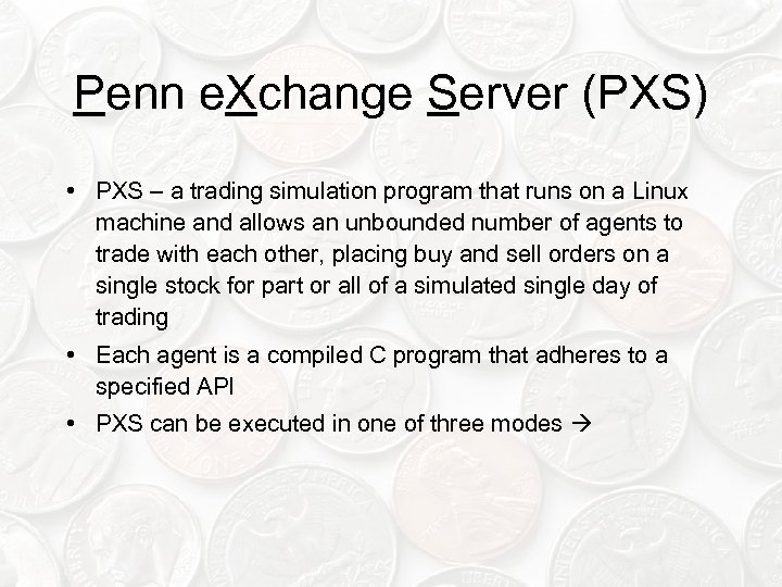 Penn e. Xchange Server (PXS) • PXS – a trading simulation program that runs on a Linux machine and allows an unbounded number of agents to trade with each other, placing buy and sell orders on a single stock for part or all of a simulated single day of trading • Each agent is a compiled C program that adheres to a specified API • PXS can be executed in one of three modes