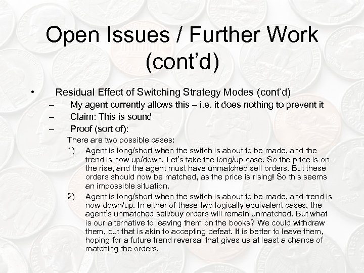 Open Issues / Further Work (cont’d) • Residual Effect of Switching Strategy Modes (cont’d) – – – My agent currently allows this – i. e. it does nothing to prevent it Claim: This is sound Proof (sort of): There are two possible cases: 1) Agent is long/short when the switch is about to be made, and the trend is now up/down. Let’s take the long/up case. So the price is on the rise, and the agent must have unmatched sell orders. But these orders should now be matched, as the price is rising! So this seems an impossible situation. 2) Agent is long/short when the switch is about to be made, and trend is now down/up. In either of these two logically equivalent cases, the agent’s unmatched sell/buy orders will remain unmatched. But what is our alternative to leaving them on the books? We could withdraw them, but that is akin to accepting defeat. It is better to leave them, hoping for a future trend reversal that gives us at least a chance of matching the orders.