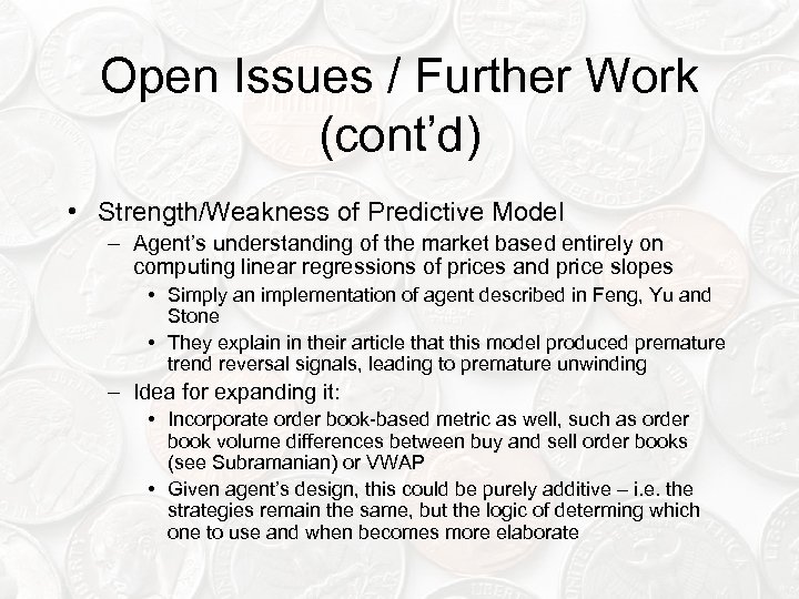 Open Issues / Further Work (cont’d) • Strength/Weakness of Predictive Model – Agent’s understanding of the market based entirely on computing linear regressions of prices and price slopes • Simply an implementation of agent described in Feng, Yu and Stone • They explain in their article that this model produced premature trend reversal signals, leading to premature unwinding – Idea for expanding it: • Incorporate order book-based metric as well, such as order book volume differences between buy and sell order books (see Subramanian) or VWAP • Given agent’s design, this could be purely additive – i. e. the strategies remain the same, but the logic of determing which one to use and when becomes more elaborate