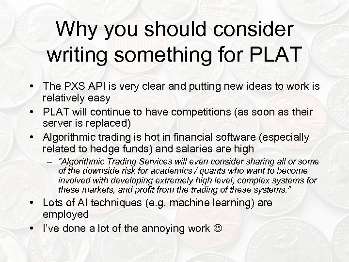 Why you should consider writing something for PLAT • The PXS API is very clear and putting new ideas to work is relatively easy • PLAT will continue to have competitions (as soon as their server is replaced) • Algorithmic trading is hot in financial software (especially related to hedge funds) and salaries are high – “Algorithmic Trading Services will even consider sharing all or some of the downside risk for academics / quants who want to become involved with developing extremely high level, complex systems for these markets, and profit from the trading of these systems. ” • Lots of AI techniques (e. g. machine learning) are employed • I’ve done a lot of the annoying work